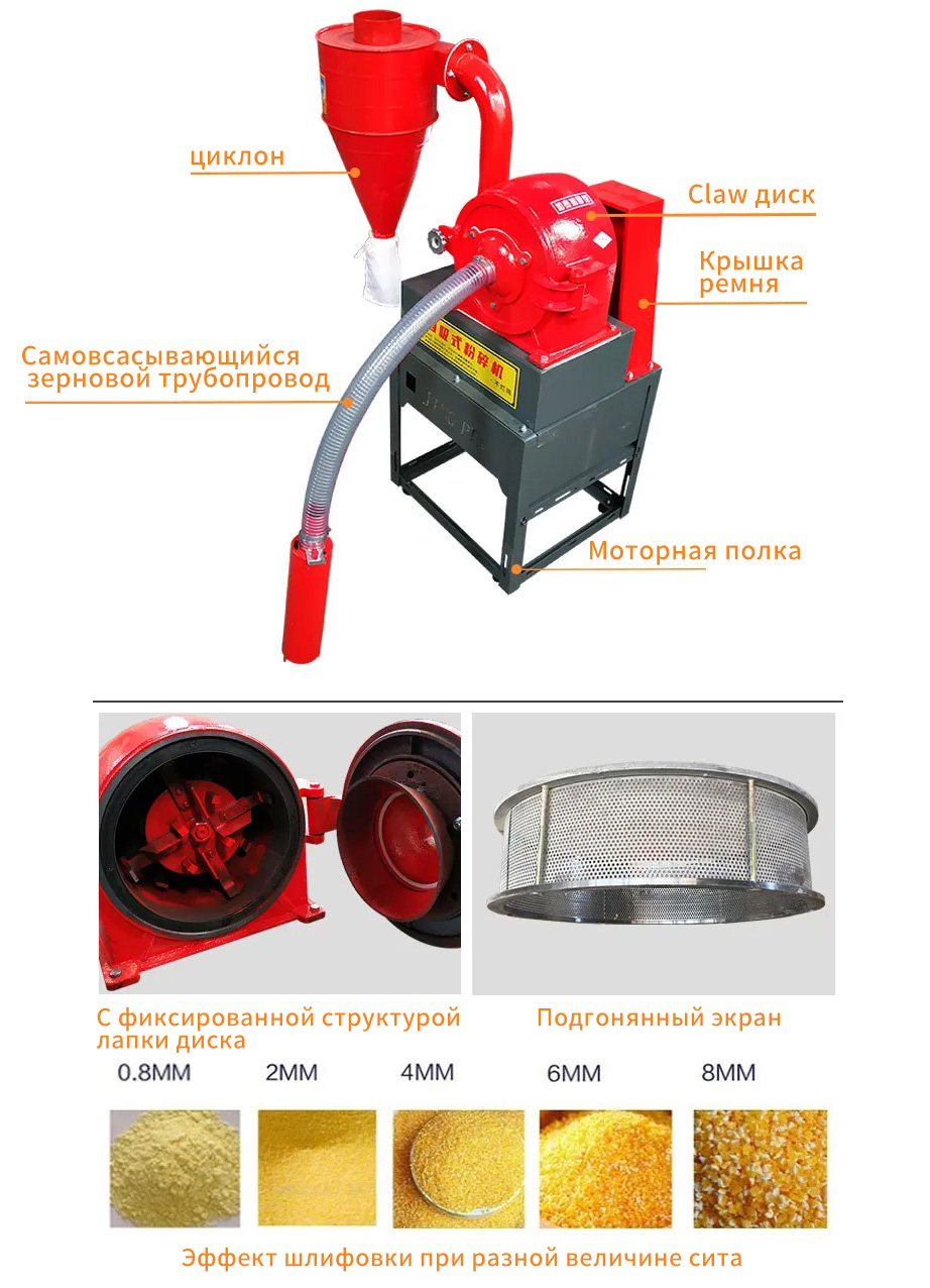 - гибко адаптируется к различным масштабам: урожайность регулируется с помощью экрана ( 500 кг/ч), мелкие и средние фермеры измельчают корм для цыплят с помощью тонкого экрана (500 кг/ч), а крупные фермы измельчают корм для крупного рогатого скота с помощью грубого экрана (более высокая урожайность), чтобы удовлетворить потребности различных масштабов и избежать потери мощности.